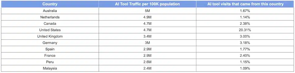 - Europeans are the most reliant on AI, with five countries averaging 3.5M annual AI platform visits per person.